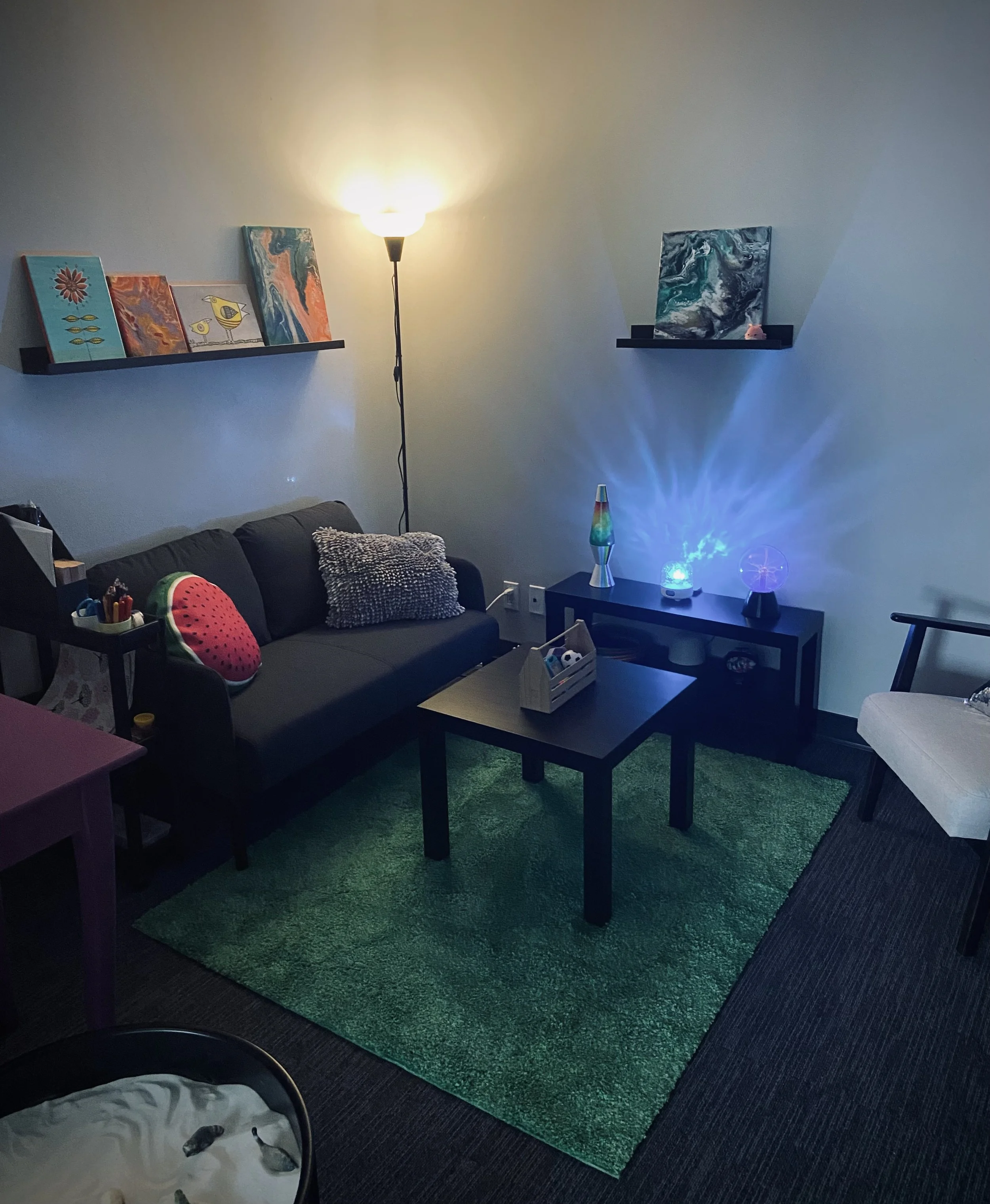 Fully furnished, sensory-friendly, thoughtfully designed therapy office and sensory room available for sublease. Perfect for clinicians working with children, youth, families, or adults.